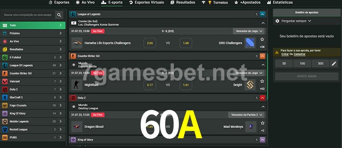 O 60A oferece uma grande seleção de opções de apostas em e-sports com probabilidades competitivas